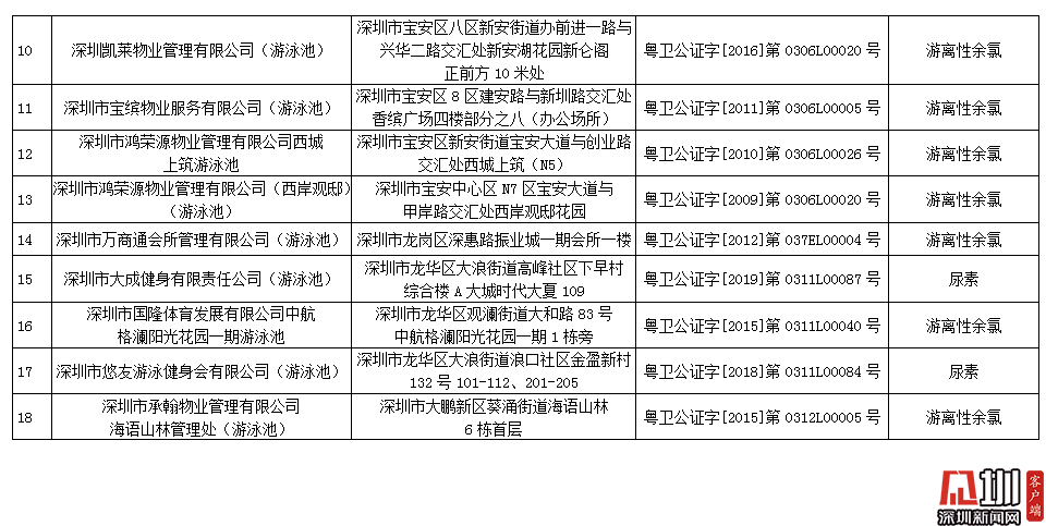 記者獲悉,深圳市夢(mèng)六健身有限公司(游泳池)pH值和游離性余氯指標(biāo)不合格,深圳市百利行物業(yè)發(fā)展有限公司中信紅樹(shù)灣花城物業(yè)管理處(游泳池)、深圳市大成健身有限責(zé)任公司(游泳池)、深圳市悠友游泳健身會(huì)有限公司(游泳池)尿素指標(biāo)不合格,加福投資(深圳)有限公司福朋喜來(lái)登酒店(游泳池)、深圳市蓮花物業(yè)管理有限公司彩田村游泳場(chǎng)、深圳大中華國(guó)際酒店管理有限公司大中華希爾頓酒店(游泳池)、深圳市京基物業(yè)管理有限公司濱河時(shí)代物業(yè)服務(wù)中心(游泳池)、深圳新都酒店股份有限公司新都酒店(游泳池)、深圳陽(yáng)光酒店(游泳池)、深圳市金地物業(yè)管理有限公司翠盈嘉園管理處(游泳池)、深圳凱萊物業(yè)管理有限公司(游泳池)、深圳市寶繽物業(yè)服務(wù)有限公司(游泳池)、深圳市鴻榮源物業(yè)管理有限公司西城上筑游泳池、深圳市鴻榮源物業(yè)管理有限公司(西岸觀?。ㄓ斡境兀⑸钲谑腥f(wàn)商通會(huì)所管理有限公司(游泳池)、深圳市國(guó)隆體育發(fā)展有限公司中航格瀾陽(yáng)光花園一期游泳池、深圳市承翰物業(yè)管理有限公司海語(yǔ)山林管理處(游泳池)游離性余氯指標(biāo)不合格。衛(wèi)生監(jiān)督部門已責(zé)令抽檢結(jié)果不合格單位立即整改,并跟蹤整改情況。