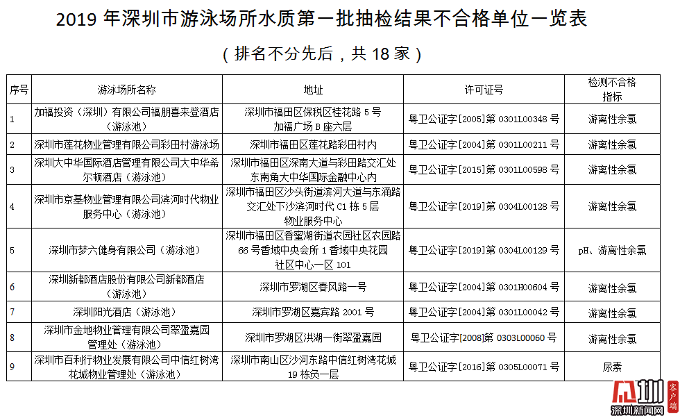 深圳新聞網(wǎng)2019年7月10日訊(記者 劉夢(mèng)婷 通訊員 深衛(wèi)監(jiān))你常光顧的游泳池水質(zhì)如何?日前,深圳市衛(wèi)生監(jiān)督局公布了2019年第一批游泳場(chǎng)所水質(zhì)抽檢結(jié)果。在抽檢的435家游泳場(chǎng)所中,合格的有417家,合格率為95.86%,不合格18家,不合格率為4.14%,其中不乏知名五星級(jí)酒店。