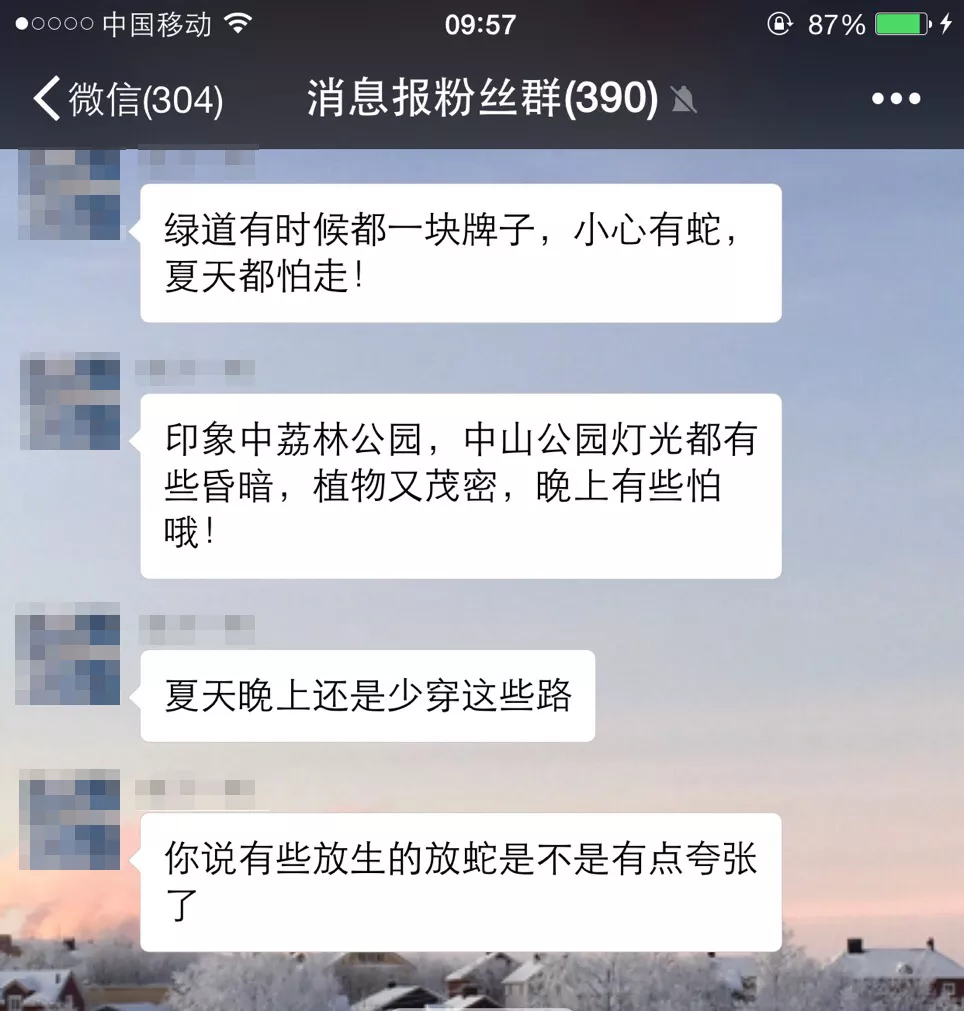 荔林公園蛇出沒的消息,在蛇口消息報微信粉絲群里炸開了鍋,有網友表示,此現象甚是危險,希望能加強管理。