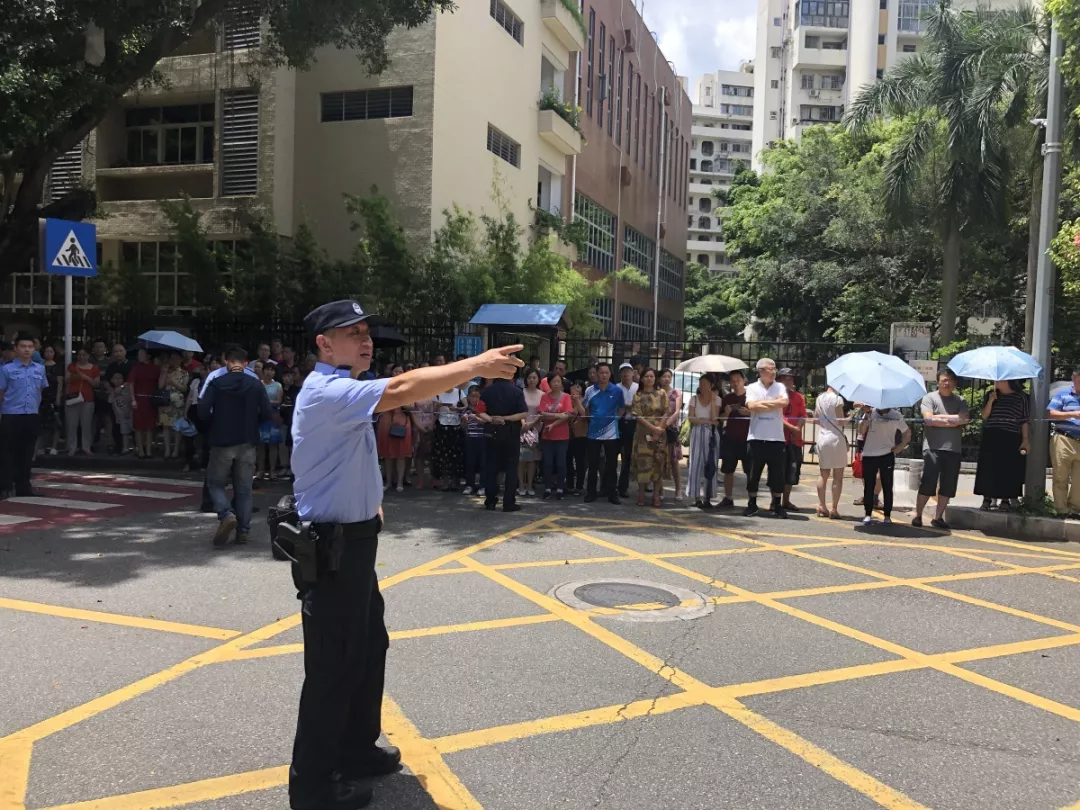 在深圳實驗中學(xué)的校門外,正在執(zhí)勤護(hù)考的通心嶺派出所所長林志強(qiáng)正跟送考的家長們“嘮嗑”。“大家都站這么久了,辛苦了!一會考試結(jié)束后,咱們來猜一猜第一個走出來的是男生還是女生?!薄拔也率悄猩!薄拔也率桥??!奔议L們一掃臉上焦急的表情,開始笑著討論起來。