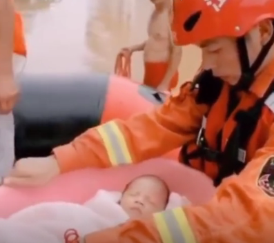 消防員用塑料盆將嬰兒轉(zhuǎn)移