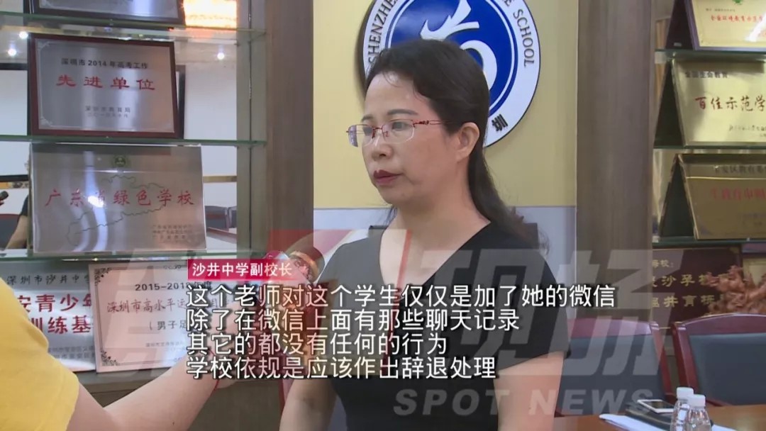 為詳細了解實際情況,記者來到了李先生女兒就讀的沙井中學,學校的副校長出面回應稱,李先生反映的老師騷擾他女兒的情況確實存在,當事人屬于臨聘教師,去年9月到該校任教,目前已經(jīng)被校方開除。