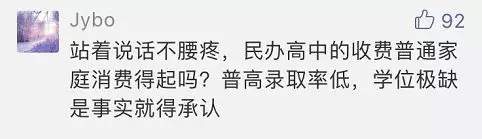 45.38%的公辦普高錄取率意味著有一半以上的學(xué)生上不了公辦普高,只能求其次,選擇職業(yè)學(xué)校和民辦高中。雖然說(shuō)教育沒(méi)有高低之分,但是絕大多數(shù)家長(zhǎng)都希望自己的孩子能夠上公辦普高,這也是競(jìng)爭(zhēng)激烈的原因之一。為什么接受不了民辦高中?除了擔(dān)心辦學(xué)質(zhì)量問(wèn)題,網(wǎng)友主要覺(jué)得民辦學(xué)費(fèi)貴。