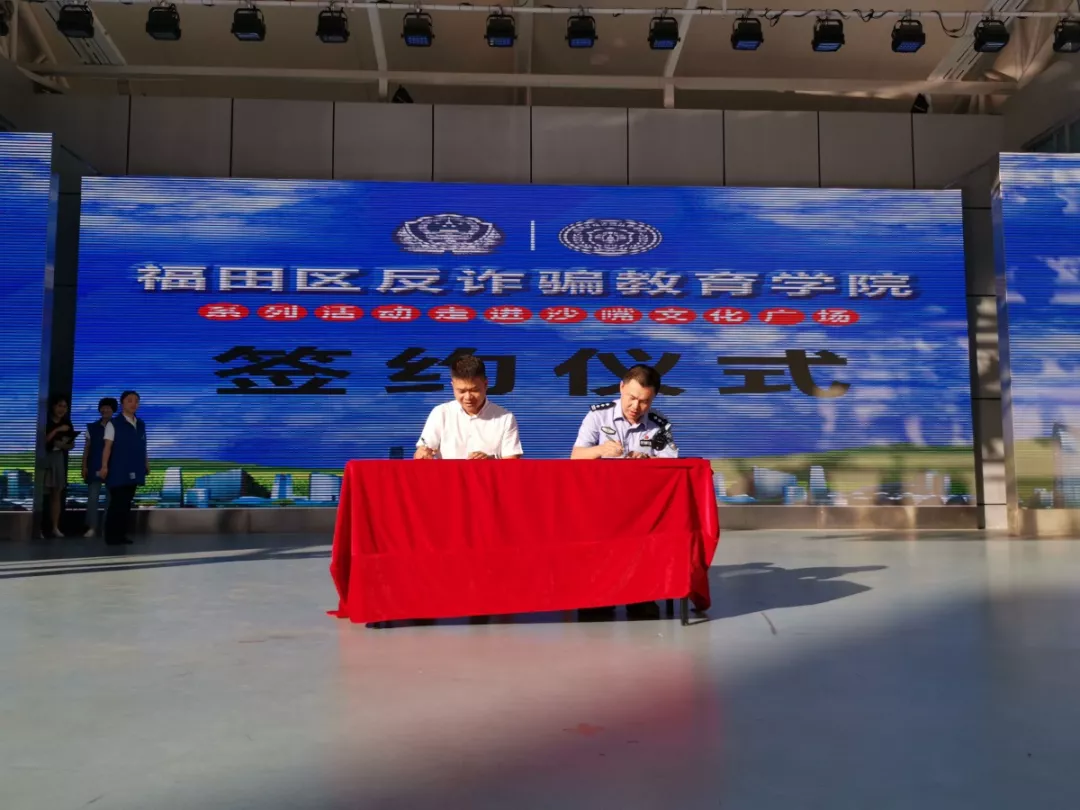 活動(dòng)現(xiàn)場(chǎng),肖劍平所長與沙頭街道辦黨工委副書記熊新清及沙嘴實(shí)業(yè)股份有限公司簽署了《福田反詐騙教育??窇?zhàn)略合作協(xié)議。