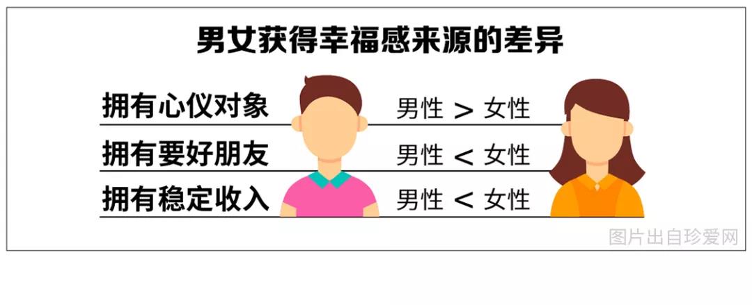 深入研究發(fā)現(xiàn),男性對“擁有心儀對象”的需求比例(6.67%)略高于女性(3.17%),女性則是在擁有要好朋友的比例(28.79%)上高于男性(6.67%),且因?yàn)榉€(wěn)定收入感到幸福的女性比例(60%)比男性(53%)更高。可見,女性更容易從穩(wěn)定的收入中獲得幸福感。