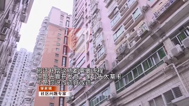而社區(qū)問題專家鄒家健表示,城市的更新改造有一定程序,開發(fā)商需要先向政府部門進(jìn)行報批,并且按照深圳城市更新政策來說,業(yè)主的城市更新意愿應(yīng)當(dāng)達(dá)100%才可以進(jìn)行舊改,并非開發(fā)商所說的“雙三分之二”。