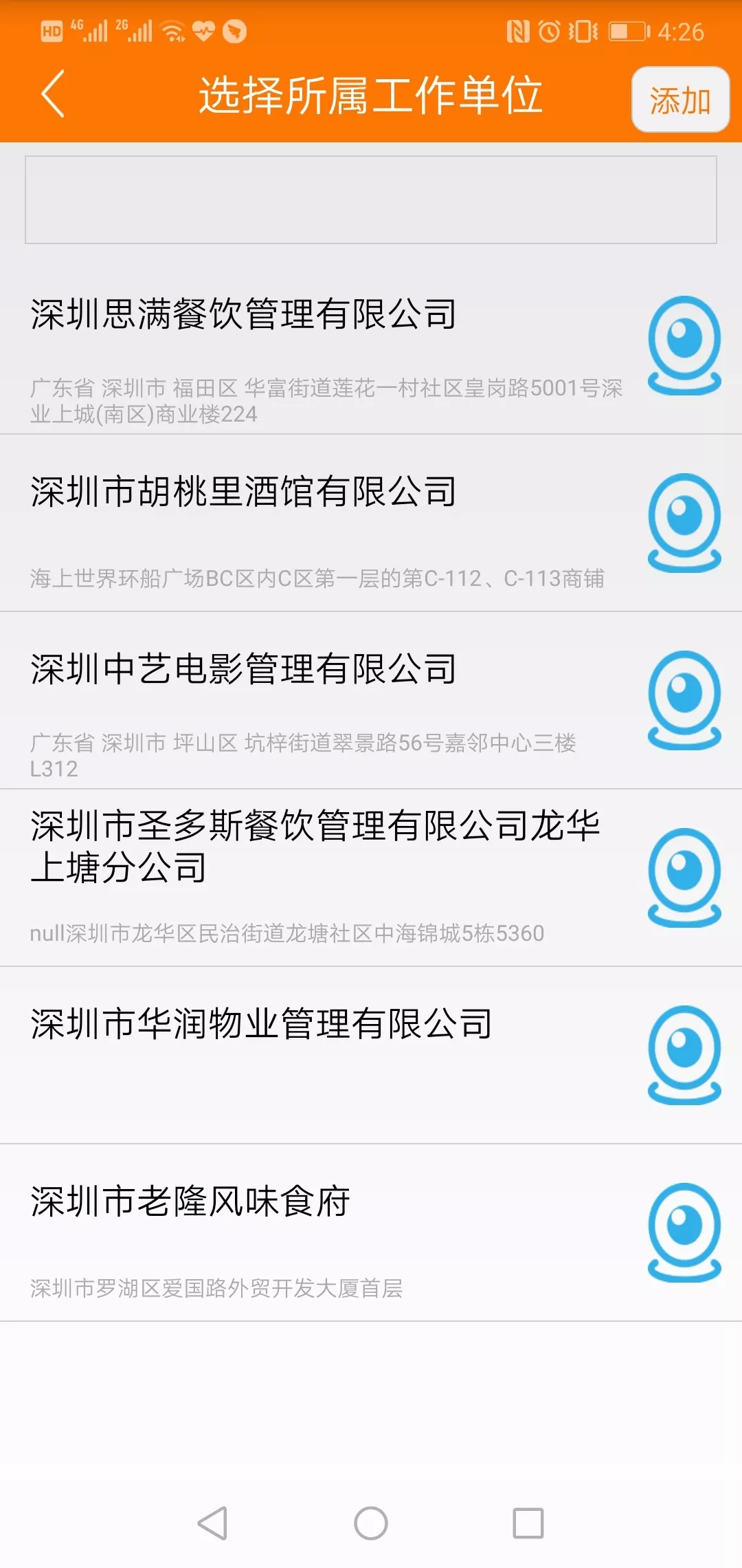 在選擇所屬單位時,可以通過搜索“名稱關鍵詞”快速查詢,如果沒有你的餐廳或單位名字,可以點右上角的【添加】來添加。
