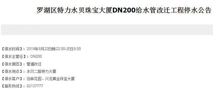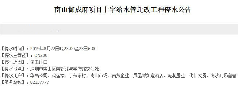 停水客戶:南山慢性病防治院、南油小學、南油物業(yè)1棟-23棟小區(qū)、南油物業(yè)24棟-29棟小區(qū)、恒大天璟大廈、深圳市信澤實業(yè)發(fā)展有限公司