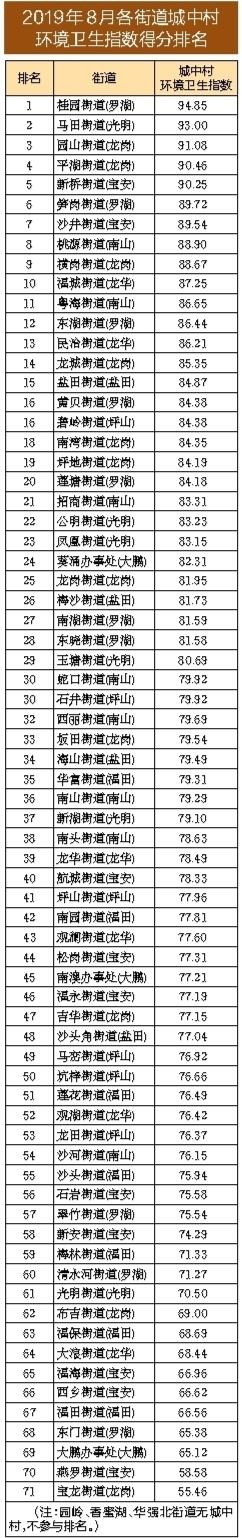 全市城中村首次單獨(dú)“應(yīng)考”,成績?nèi)绾危扛鶕?jù)公布的測(cè)評(píng)結(jié)果,深圳市城中村環(huán)境衛(wèi)生指數(shù)為79.05分,光明區(qū)、羅湖區(qū)、龍崗區(qū)城中村環(huán)境衛(wèi)生指數(shù)位列三甲,城中村人口密度較大的福田區(qū)則在首次公布的城中村環(huán)境衛(wèi)生指數(shù)排名中墊底。排名前3的街道分別是桂園街道(羅湖)、馬田街道(光明)和園山街道(龍崗),而排名后3的街道分別是寶龍街道(龍崗)、燕羅街道(寶安)和大鵬辦事處(大鵬)。