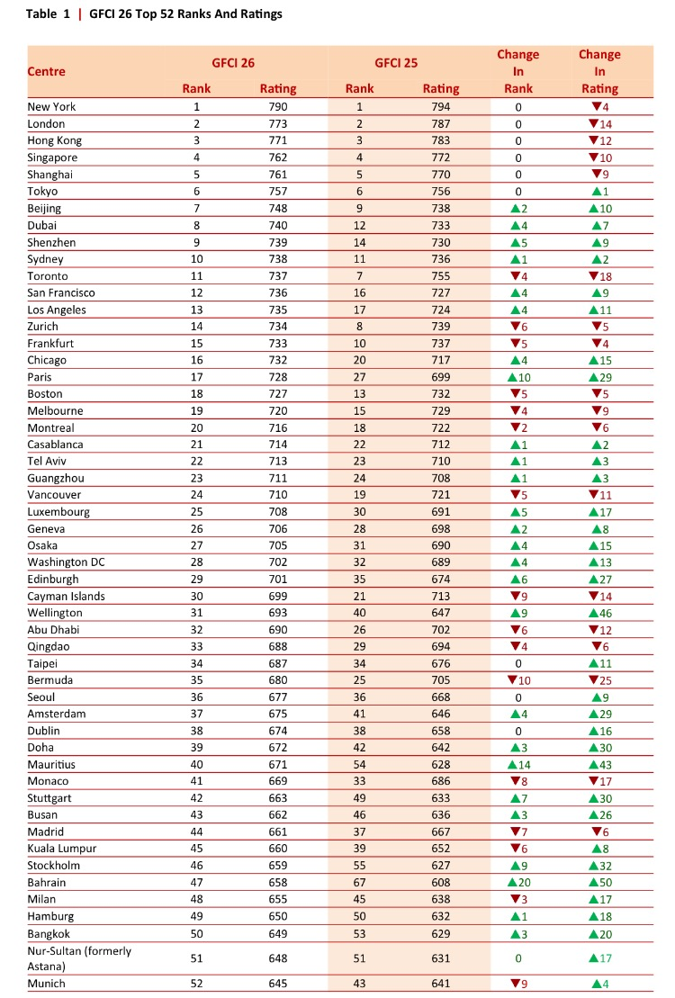 本期全球金融中心指數(shù)從營商環(huán)境、人力資源、基礎(chǔ)設(shè)施、發(fā)展水平、國際聲譽(yù)等方面對(duì)全球主要金融中心進(jìn)行評(píng)價(jià)和排名,共有104個(gè)金融中心進(jìn)入榜單。全球前十大金融中心排名依次為:紐約、倫敦、香港、新加坡、上海、東京、北京、迪拜、深圳、悉尼。