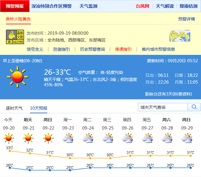 見(jiàn)圳客戶(hù)端·深圳新聞網(wǎng)2019年9月20日訊 深圳市氣象局預(yù)計(jì)氣溫26-33℃;東北風(fēng)2-3級(jí);相對(duì)濕度50%-80%。 21-22日持續(xù)晴天干燥;23-26日以多云為主。