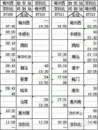 其中,梅州往返廣州12趟,往返深圳10趟,往返潮汕站8趟,往返汕頭8趟,往返珠海、廈門、宜昌各2趟。