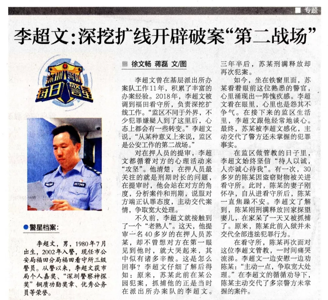 李超文曾在基層派出所辦案隊工作11年,積累了豐富的辦案經(jīng)驗(yàn)。2018年,李超文被調(diào)到福田看守所,負(fù)責(zé)深挖擴(kuò)線工作?!氨O(jiān)區(qū)不同于外界,不少犯罪嫌疑人到了這里后,心態(tài)上都會有一些轉(zhuǎn)變?!崩畛恼f,“從某種意義上來說,監(jiān)區(qū)是公安工作的第二戰(zhàn)場?!?/p>