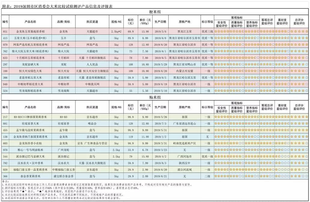 大米比較試驗(yàn)測(cè)評(píng)產(chǎn)品信息及評(píng)級(jí)表↓