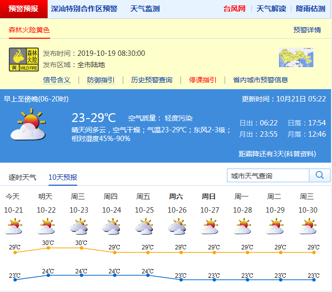 見圳客戶端·深圳新聞網(wǎng)2019年10月21日訊 深圳未來一周天氣較為穩(wěn)定,天氣持續(xù)干燥,預(yù)計(jì)21日晴天間多云,早晚能見度較差,有輕霧;氣溫23-29℃;東風(fēng)2-3級;相對濕度45%-90%。22日晴天間多云,早晚有輕霧;23-24日多云,偶有零星小雨,早晚有輕霧;25-27日晴天干燥。
