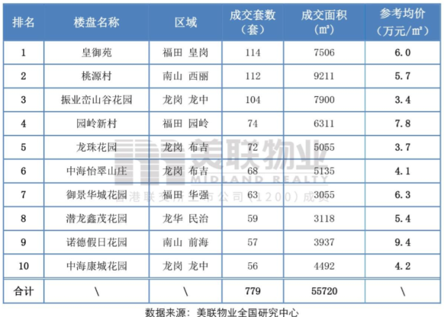 2019年第三季度深圳二手住宅成交TOP10
