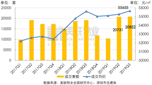 2019年第三季度二手住宅市場延續(xù)第二季度成交熱度,共備案20852套二手住宅,再創(chuàng)三年來季度成交量新高,較今年第二季度上升0.6%,同比去年第三季度上升8.9%;總成交面積約173.80萬㎡。美聯(lián)物業(yè)(深圳)藍(lán)籌住宅價格方面,今年第三季度全市二手住宅的成交均價為55655元/㎡,較第二季度上漲0.7%,同比去年第三季度上漲0.1%。