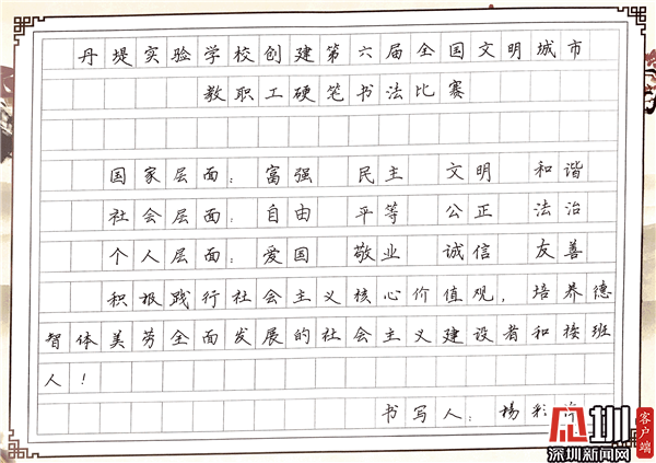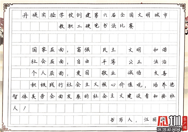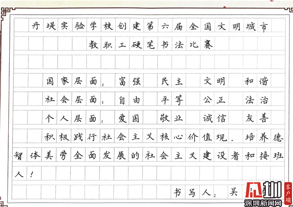見圳客戶端·深圳新聞網(wǎng)10月29日訊(見圳客戶端、深圳新聞網(wǎng)記者 潘寶儀 通訊員 袁小俊 圖/朱雅琪 ) 為落實立德樹人總目標、培育和踐行社會主義核心價值觀,創(chuàng)建文明城市,積極倡導(dǎo)全校教職工勤練教學基本功,提高教師綜合素養(yǎng),豐富課余生活,展示丹堤實驗學校教職工風采,學校于10月25日舉行了“創(chuàng)建第六屆全國文明城市教職工硬筆書法比賽”。
