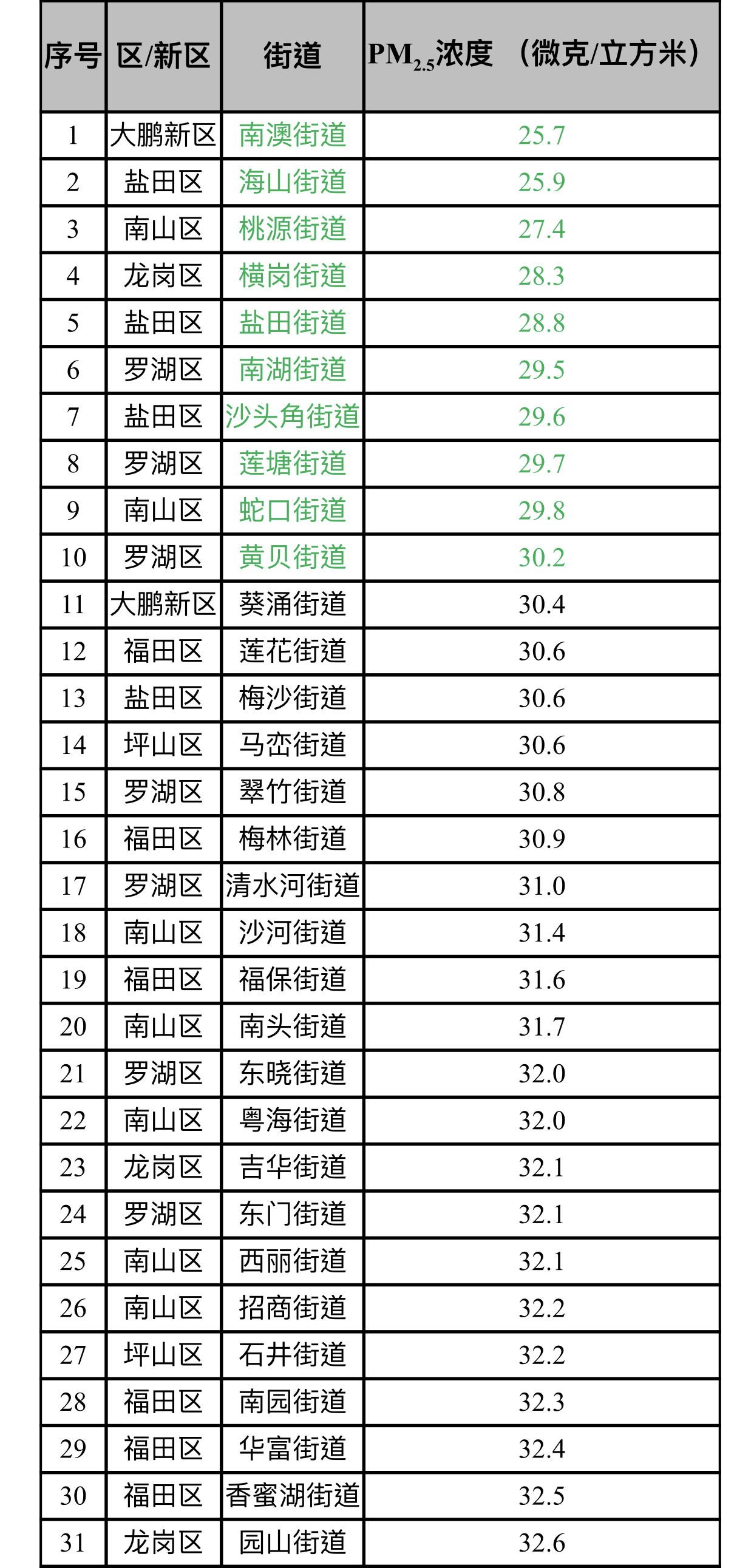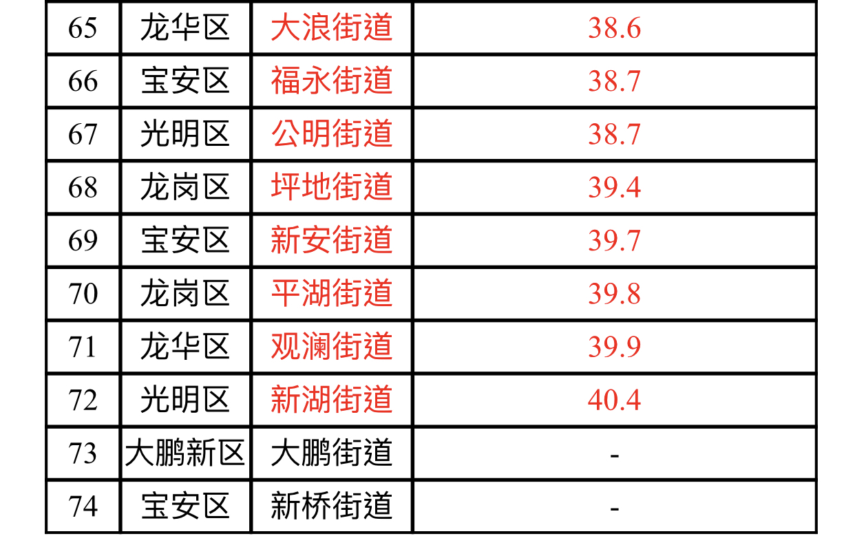 見圳客戶端·深圳新聞網(wǎng)2019年11月5日訊(見圳客戶端、深圳新聞網(wǎng)記者陳婕)11月5日,記者從深圳市生態(tài)環(huán)境局了解到,2019年10月,全市74個(gè)街道PM2.5濃度在25.7-40.4微克/立方米之間,均值為33.3微克/立方米。排名前十的是:南澳、海山、桃源、橫崗、鹽田、南湖、沙頭角、蓮塘、蛇口和黃貝等街道,排名倒數(shù)前十的是:新湖、觀瀾、平湖、新安、坪地、公明、福永、大浪、龍城和馬田等街道。