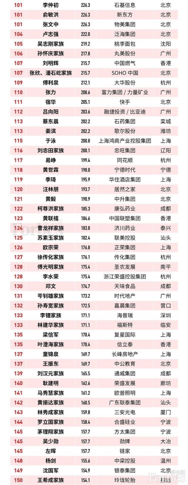 編制本榜單使用的持股和財(cái)務(wù)信息取自家族和個(gè)人、證交所、分析師和監(jiān)管機(jī)構(gòu)。資產(chǎn)計(jì)算使用的是截至10月25日的股價(jià)和匯率。非上市公司的估值基于對(duì)同類上市公司的分析評(píng)估。被抵押股權(quán)予以折價(jià)計(jì)算。與福布斯全球億萬富豪榜不同,福布斯中國富豪榜包括參與配偶生意的夫婦。一些估算還包括其他家族成員擁有的資產(chǎn)。