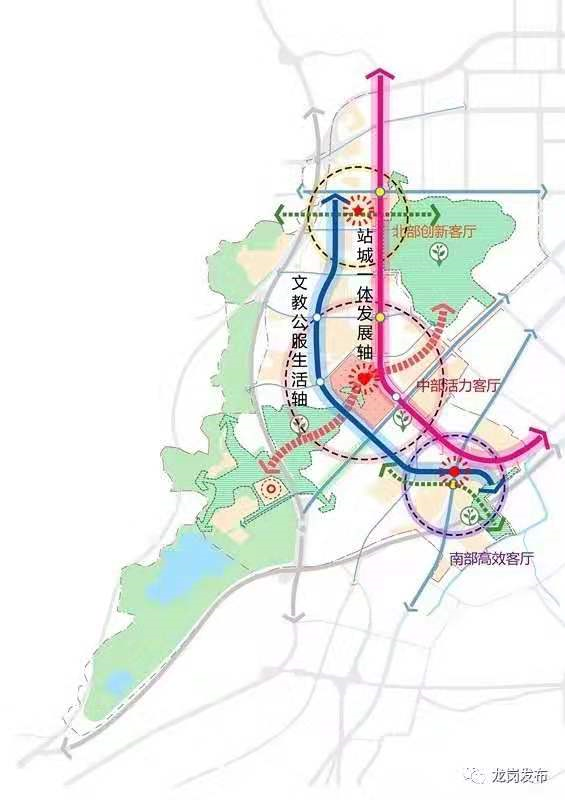2019年7月,備受矚目的大運(yùn)新城城市設(shè)計(jì)成果經(jīng)深圳市規(guī)劃和自然資源局審議正式出爐。未來(lái)的大運(yùn)新城將是一座生態(tài)文明健康、學(xué)習(xí)文化濃厚、多維開(kāi)放連接、創(chuàng)新活力迸發(fā)的高水平城市新客廳,形成“一主兩副、三心兩軸”的總體城市框架。其中“三心”為“一主兩副”三個(gè)城市客廳,即主客廳“中部活力客廳”,副客廳“北部創(chuàng)新客廳”和“南部高效客廳”?!皟奢S”為黃閣路“站城一體發(fā)展軸”和龍飛大道“文教公服生活軸”。