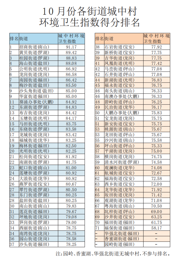 11月10日,深圳市城管和綜合執(zhí)法局同步發(fā)布了10月份城中村環(huán)境衛(wèi)生指數(shù)測(cè)評(píng)結(jié)果。10月份深圳市城中村環(huán)境衛(wèi)生指數(shù)較9月有所提升,雖有改善,但幅度不大,得分僅為77.92分,依舊是全市環(huán)境衛(wèi)生的最大短板。其中,招商街道以91.17分的高分摘取城中村環(huán)境衛(wèi)生指數(shù)排名桂冠。