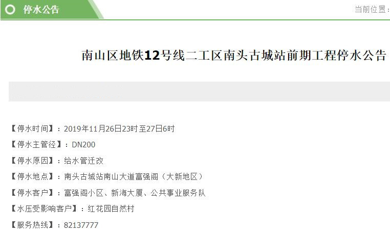 停水客戶:東華物業(yè)、中國建筑第四工程有限公司、南油小學(xué)、東華假日公寓、深圳書城物業(yè)管理有限公司、中國建筑第四工程局有限公司、深圳市南山區(qū)城市管理局(文心公園)、深圳市萬商物業(yè)管理有限公司