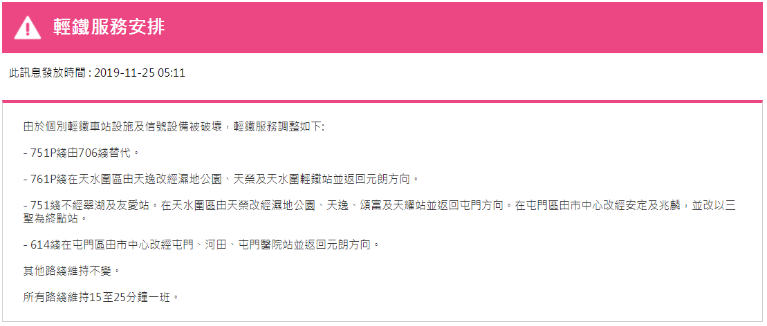 據(jù)港鐵消息,11月25日,香港地鐵各線(xiàn)(機(jī)場(chǎng)快線(xiàn)除外)、輕鐵及港鐵巴士的服務(wù)將于晚上11時(shí)結(jié)束。紅磡站恢復(fù)列車(chē)服務(wù),但只開(kāi)放B、C出入口。大學(xué)站繼續(xù)關(guān)閉,列車(chē)不停大學(xué)站,個(gè)別車(chē)站出入口也會(huì)暫時(shí)關(guān)閉。