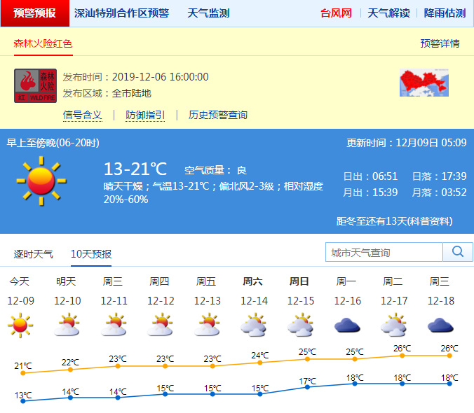 見圳客戶端·深圳新聞網(wǎng)2019年12月9日訊 連日來的降溫,讓許多市民懷疑“深圳難道入冬啦?”周末早晨,全市最低氣溫只有10-12℃??諝夥浅8稍?,深圳市森林火險(xiǎn)紅色預(yù)警、深汕區(qū)森林火險(xiǎn)黃色預(yù)警及寒冷黃色預(yù)警信號生效中。