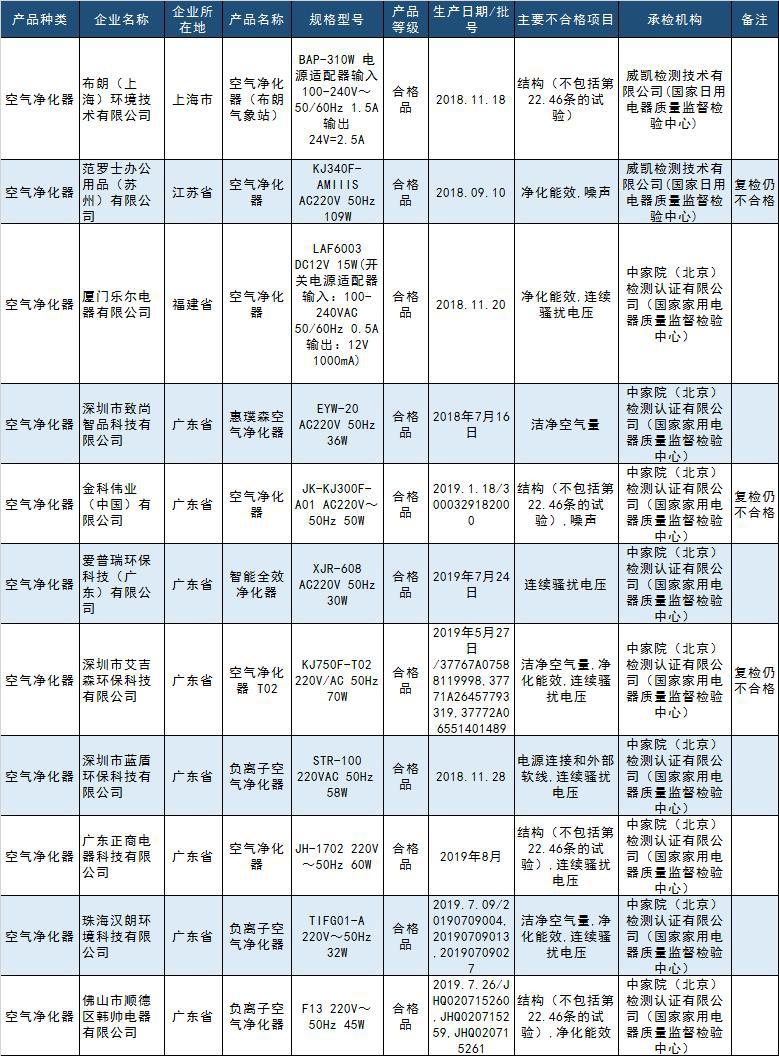 其中,深圳市艾吉森環(huán)??萍加邢薰旧a(chǎn)的空氣凈化器復(fù)檢仍不合格。