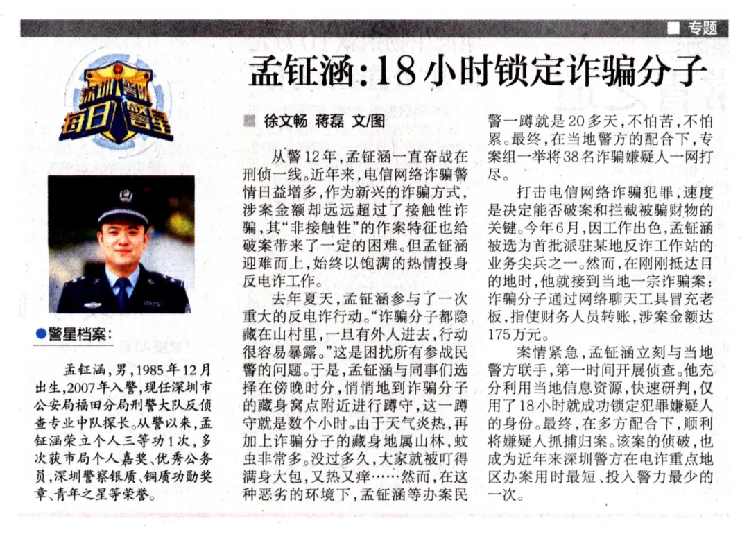 孟鉦涵,男,1985年12月出生,2007年入警,現(xiàn)任深圳市公安局福田分局刑警大隊反偵查專業(yè)中隊探長。從警以來,孟鉦涵榮立個人三等功1次,多次獲市局個人嘉獎、優(yōu)秀公務員,深圳警察銀質(zhì)、銅質(zhì)功勛獎章、青年之星等榮譽。