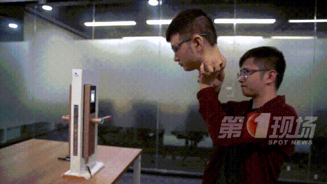 工程師事先已將自己的面部信息錄入門(mén)禁系統(tǒng),現(xiàn)在我們用這個(gè)3D頭模來(lái)開(kāi)門(mén)試試。