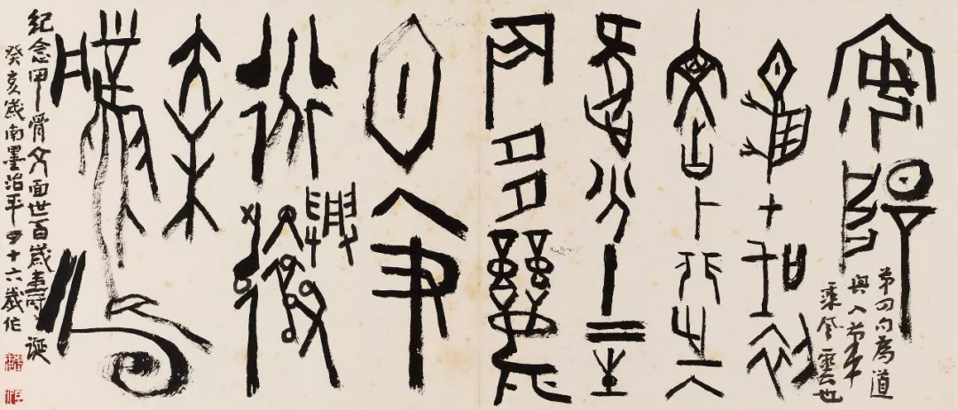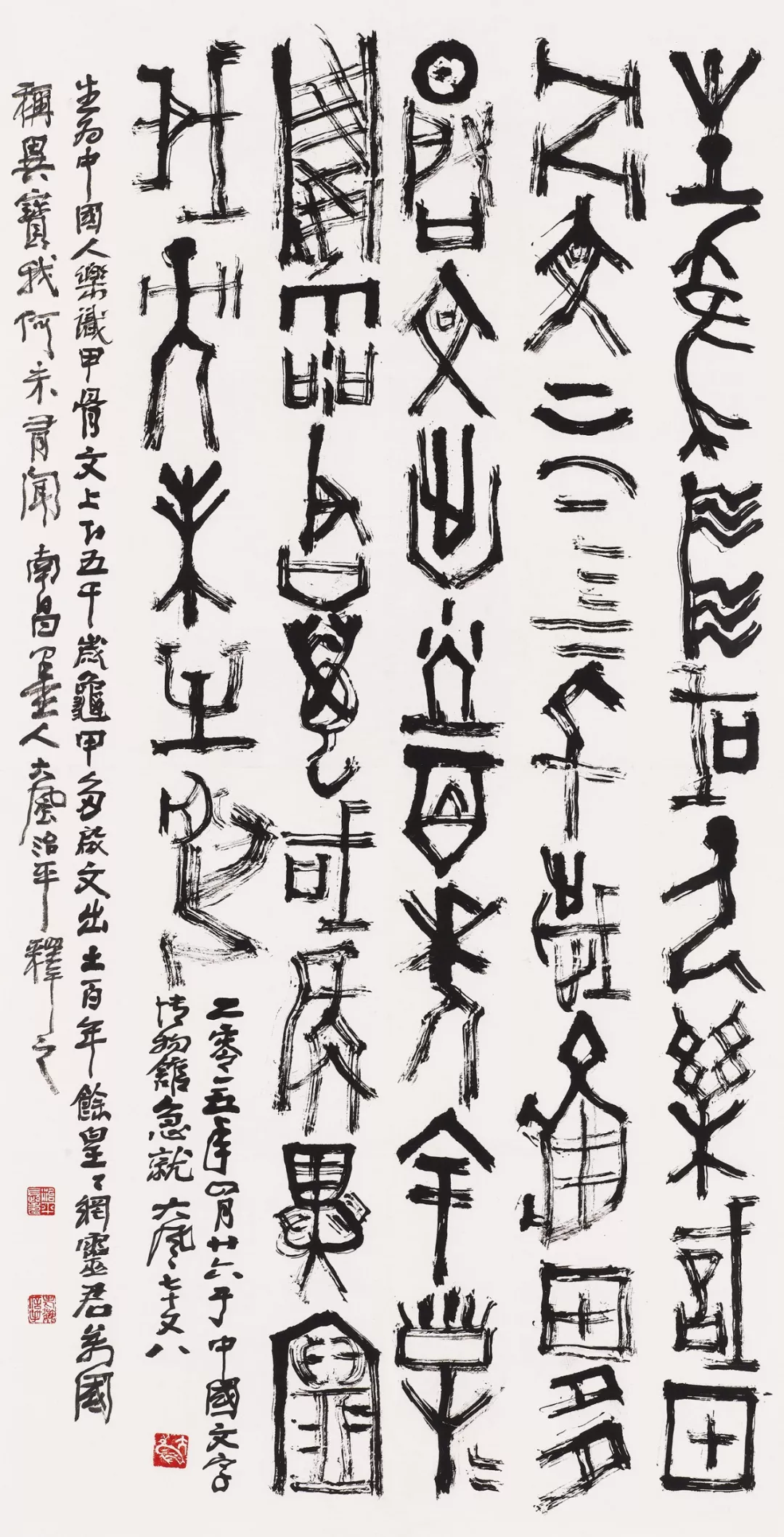 魏治平的甲骨文作品大膽構(gòu)思,探尋先祖造字奧秘。觀其書法,已經(jīng)不僅僅是寫,而是用巧妙的結(jié)構(gòu)、對(duì)文字進(jìn)行解構(gòu),形成一個(gè)整體藝術(shù)品。有的字甚至可以根據(jù)其落筆的重點(diǎn)、長(zhǎng)短等,唱出古曲。