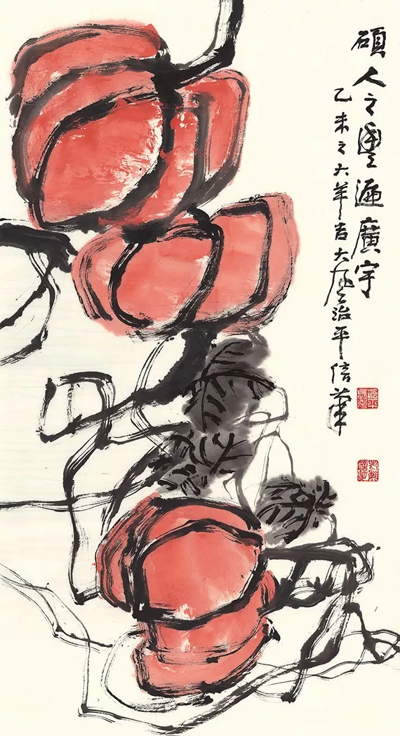 魏治平先生的畫,尤以藤類見(jiàn)長(zhǎng),構(gòu)圖奇異,筆酣墨飽;他最為推崇齊白石,繪畫技法亦師法齊白石、吳昌碩、端木夢(mèng)錫等人,瓜果菜蔬鳥蟲魚,無(wú)一不獨(dú)出心裁,氣象崢嶸,水墨淋漓之間極富創(chuàng)作精神,他筆下的南瓜、紫藤、凌霄、葡萄等更有齊白石、吳昌碩之風(fēng),自成一派,奔放不離法度,神微孕育氣魄。