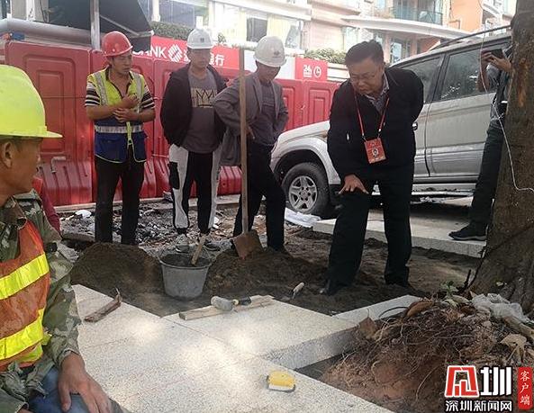深圳市人大代表胡桂梁(右一)在施工現(xiàn)場進行調研。