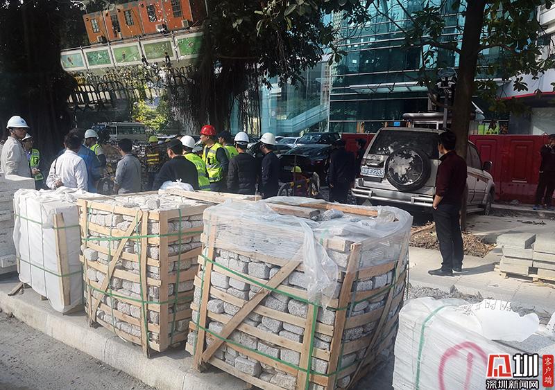上午10點,深圳市交通運輸局執(zhí)法人員來到福田區(qū)民田路與福華路路口的一處施工現(xiàn)場。記者在現(xiàn)場看到,沿著福華路一側的人行道基本全部被挖開,建筑工人正在進行人行道石磚的鋪設工作,由于施工圍擋布置不規(guī)范,現(xiàn)場也沒有完善的路線指引,不少市民出行受阻。