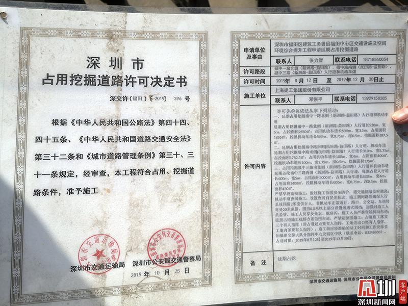 記者在現(xiàn)場了解到,目前該路段正在進行福田中心區(qū)道路品質改善提升工程的施工,施工單位為中建七局。從現(xiàn)場的占道施工許可證上,記者看到該項目自2019年8月份開始占道施工,預計2019年12月31日完工。