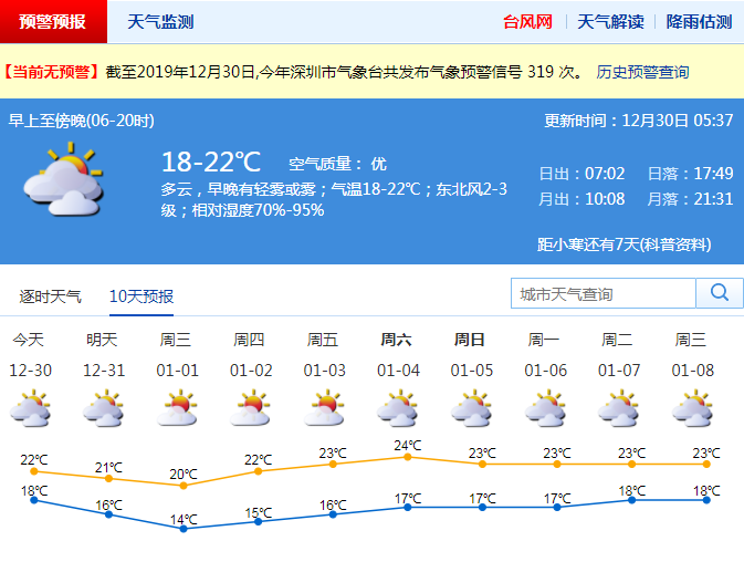 見圳客戶端·深圳新聞網2019年12月30日訊 深圳市氣象臺預計,30日我市有零星小雨轉多云,雨時能見度稍低,氣溫18-22℃;周二至周三(31日-1日)受冷空氣影響,晴天間多云,氣溫下降,最大陣風7級左右,1日最低氣溫14℃左右;周四至周日(2-5日)晴天間多云,氣溫逐日回升。