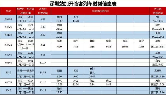為了迎接春運(yùn),深圳火車站調(diào)整了列車開行,將加開多趟臨客。目前,深圳往返肇慶的C7090/89次跨線動(dòng)車組列車暫未開行,深圳東往返懷化的K9052/1次列車已經(jīng)停運(yùn)。今天(1月8日)起,深圳往返河源的Z8006/5次將停運(yùn)。春運(yùn)期間,深圳往返梅州的T8370/69次列車將改為在深圳至大埔間開行。