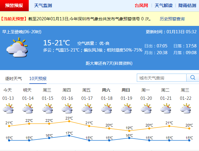 記者從深圳氣象局了解到,這周前期氣溫逐漸回升,后期氣溫小幅下降。周一到周四(13-16日)多云為主,氣溫逐漸回升,周一氣溫14-21℃,早上還較涼;周五至周日(17-19日)冷空氣影響,多云到陰天,沿海高地和海區(qū)有6-7級陣風,氣溫小幅下降,早晚較涼。