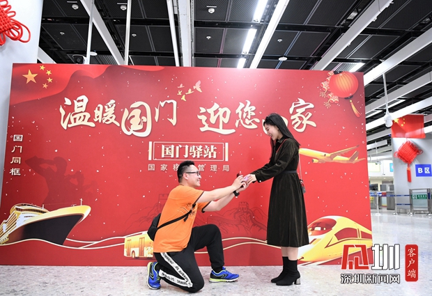 1月20日,西九龍邊檢站“國門驛站”展板前,在邊檢民警的掌聲和祝福中,旅客官先生鄭重向女友宋女士求婚,有情人終成眷屬,“在國門求婚,把愛人帶回家門”成為一段佳話。為營造溫馨喜慶的春節(jié)氛圍,該站在口岸設(shè)置主題活動(dòng)展板,懸掛節(jié)日裝飾,還研發(fā)小程序,在驗(yàn)證臺(tái)一體機(jī)向旅客展示主題海報(bào),令人耳目一新。