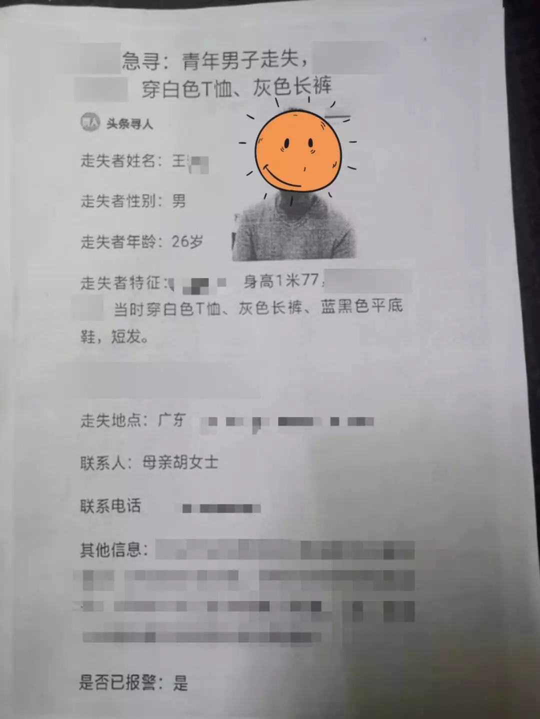 民警湯耀光立即帶隊前往尋找,最終在深圳某中學(xué)附近天橋底將走失一天的王某尋獲。民警找到王某時,其已連續(xù)步行約20小時,未進(jìn)食任何東西。隨后,民警一邊安撫該青年男子情緒,一邊扶其上車,將其帶回派出所,并當(dāng)即通知該男子父母前來接回。