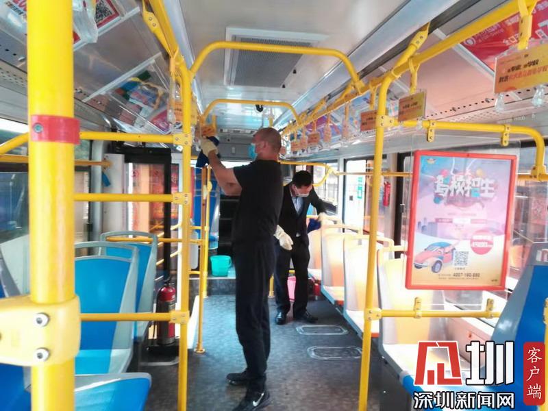 深圳巴士集團(tuán)屬下公交線路,工作人員正在對(duì)公交車廂進(jìn)行消毒。