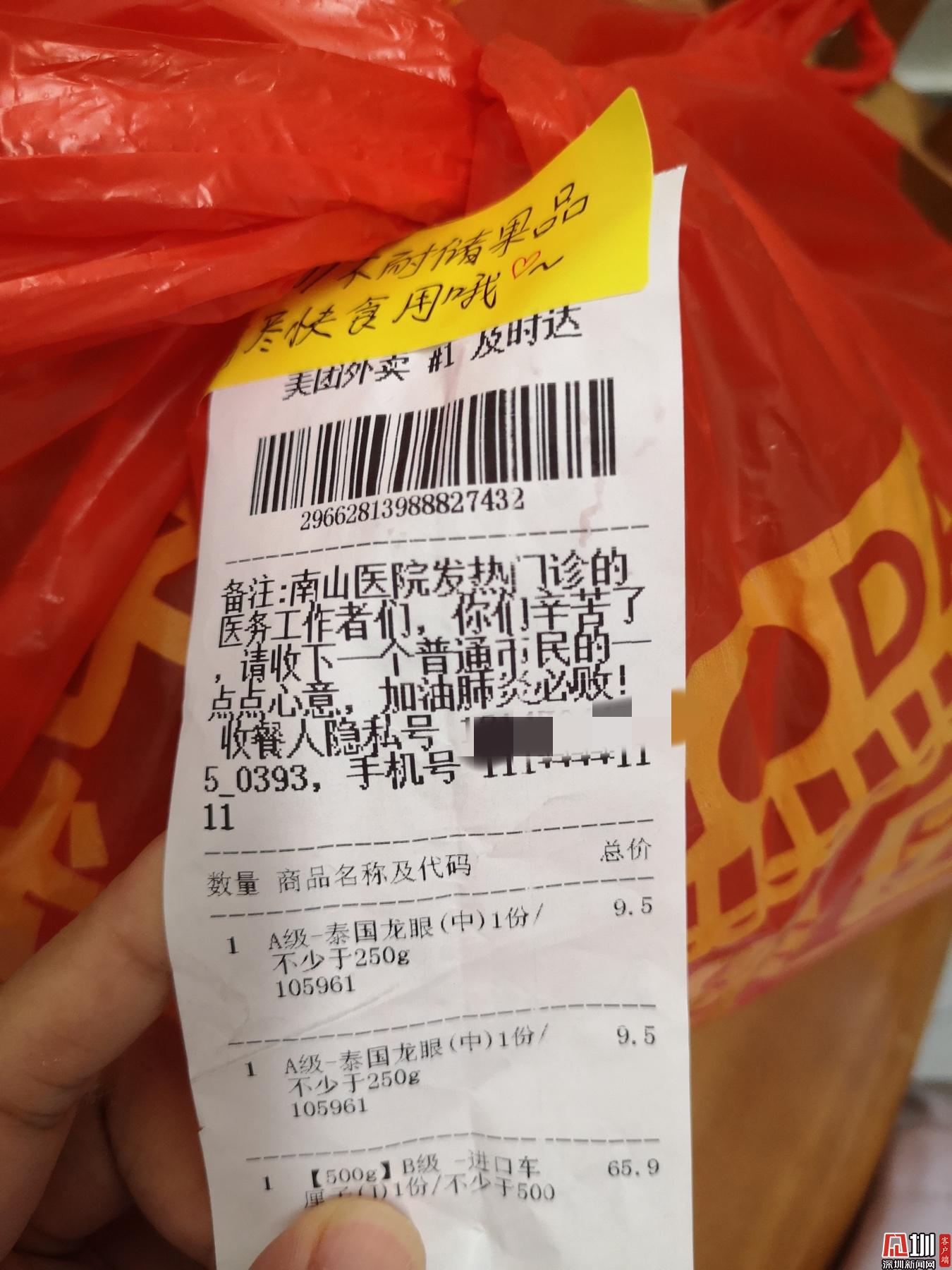 見圳客戶端·深圳新聞網(wǎng)2020年2月1日訊 (見圳客戶端、深圳新聞網(wǎng)記者 劉夢婷 通訊員 深協(xié)和)“老淚縱橫!”1月30日晚上8點56分,華中科技大學(xué)協(xié)和深圳醫(yī)院(南山醫(yī)院)手外科護士王敏在朋友圈曬了一張照片,瞬時網(wǎng)友們紛紛點贊。照片里是一個紅色塑料袋上貼著一張外賣單,備注上寫著,“南山醫(yī)院發(fā)熱門診的醫(yī)務(wù)工作者們,你們辛苦了!請收下一個普通市民的一點點心意,加油,肺炎必敗!”
