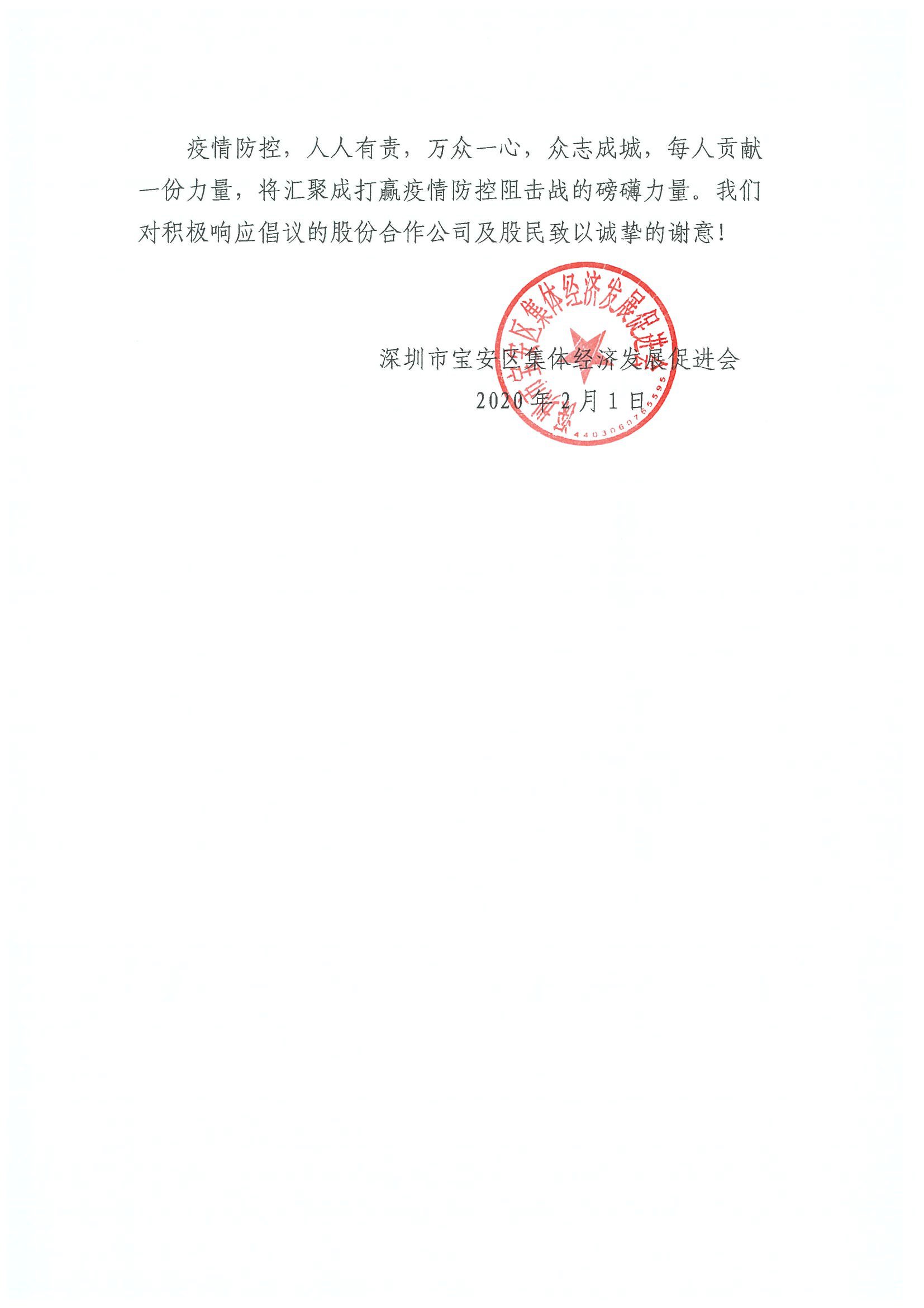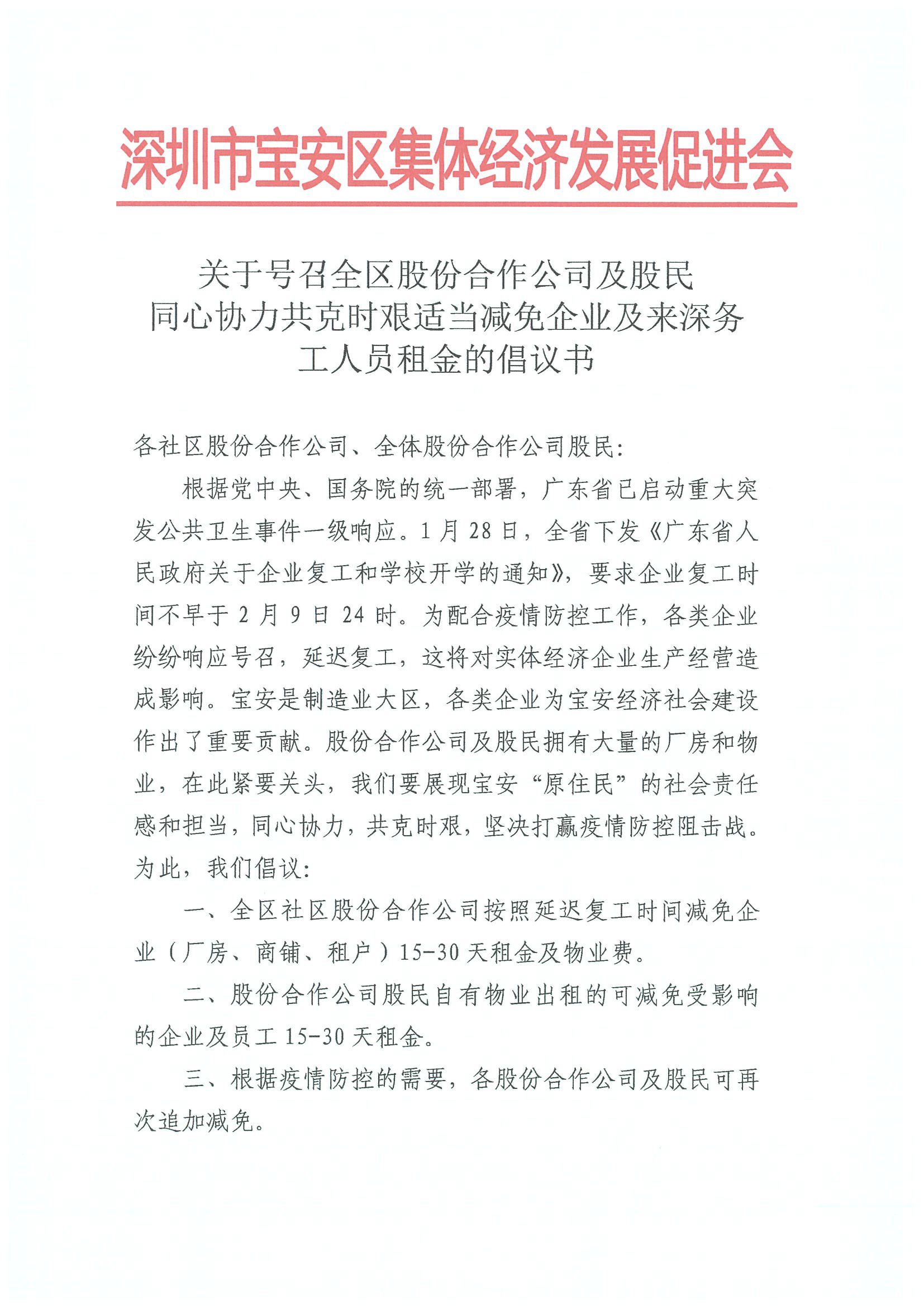 深圳新聞網(wǎng)寶安訊 “疫情防控,人人有責,萬眾一心,眾志成城,每人貢獻一份力量,將匯聚成打贏疫情防控阻擊戰(zhàn)的磅礴力量?!?月1日晚,寶安區(qū)集體資產(chǎn)管理局指導寶安區(qū)集體經(jīng)濟發(fā)展促進會向寶安區(qū)各社區(qū)股份合作公司、全體股份合作公司股民發(fā)出《同心協(xié)力共克時艱適當減免企業(yè)及來深務工人員租金的倡議書》,號召全區(qū)股份合作公司及股民適當減免企業(yè)及來深務工人員15-30天租金及物業(yè)費,并根據(jù)疫情防控的需要可再次追加減免。