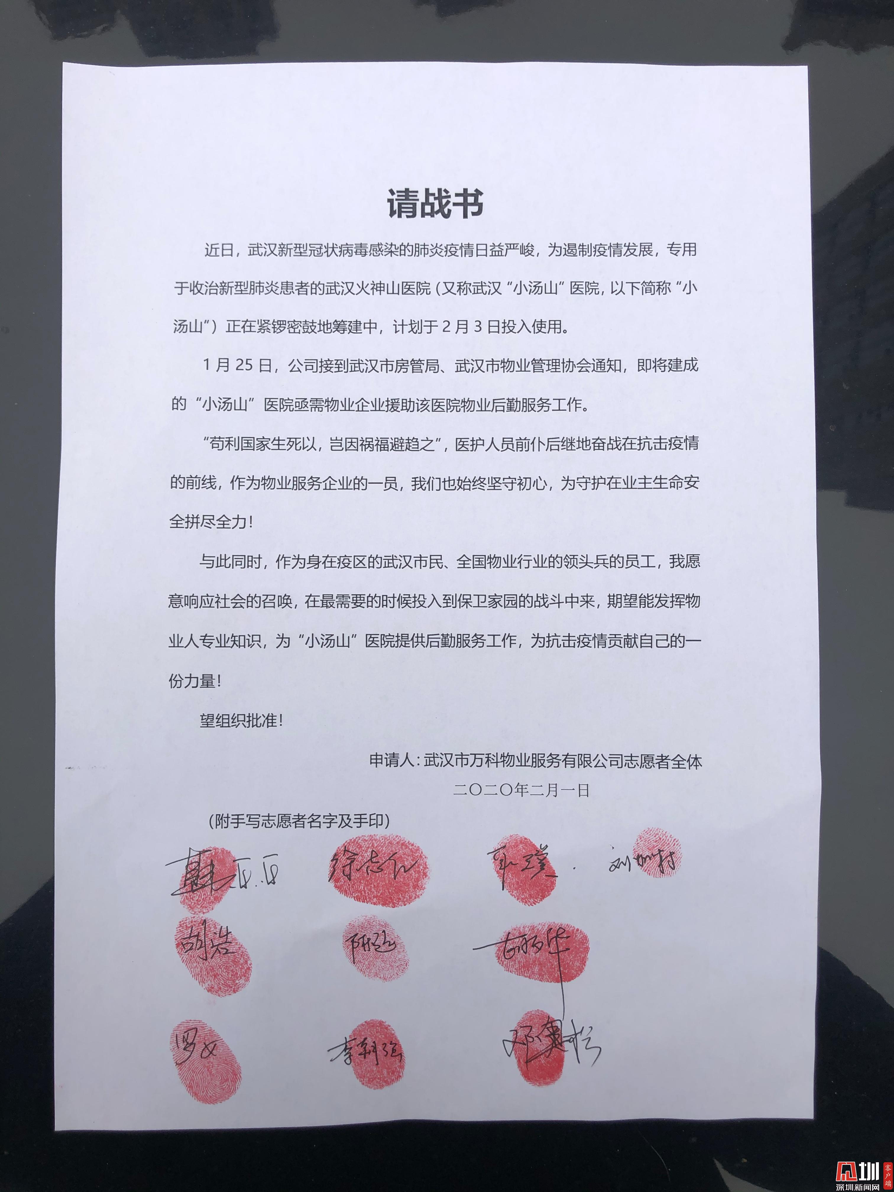 此次志愿者報(bào)名得到了大家的積極響應(yīng)。1月25日,武漢萬科物業(yè)接到武漢市物業(yè)管理協(xié)會(huì)的通知,希望萬科物業(yè)征集20名志愿者支援武漢火神山醫(yī)院。當(dāng)晚倡議書發(fā)出后,已有11人報(bào)名,到26日下午3時(shí),報(bào)名人數(shù)增加到40人。這40位自愿報(bào)名者涵蓋了物業(yè)各個(gè)崗位,既有一線員工,也有物業(yè)管理人員。