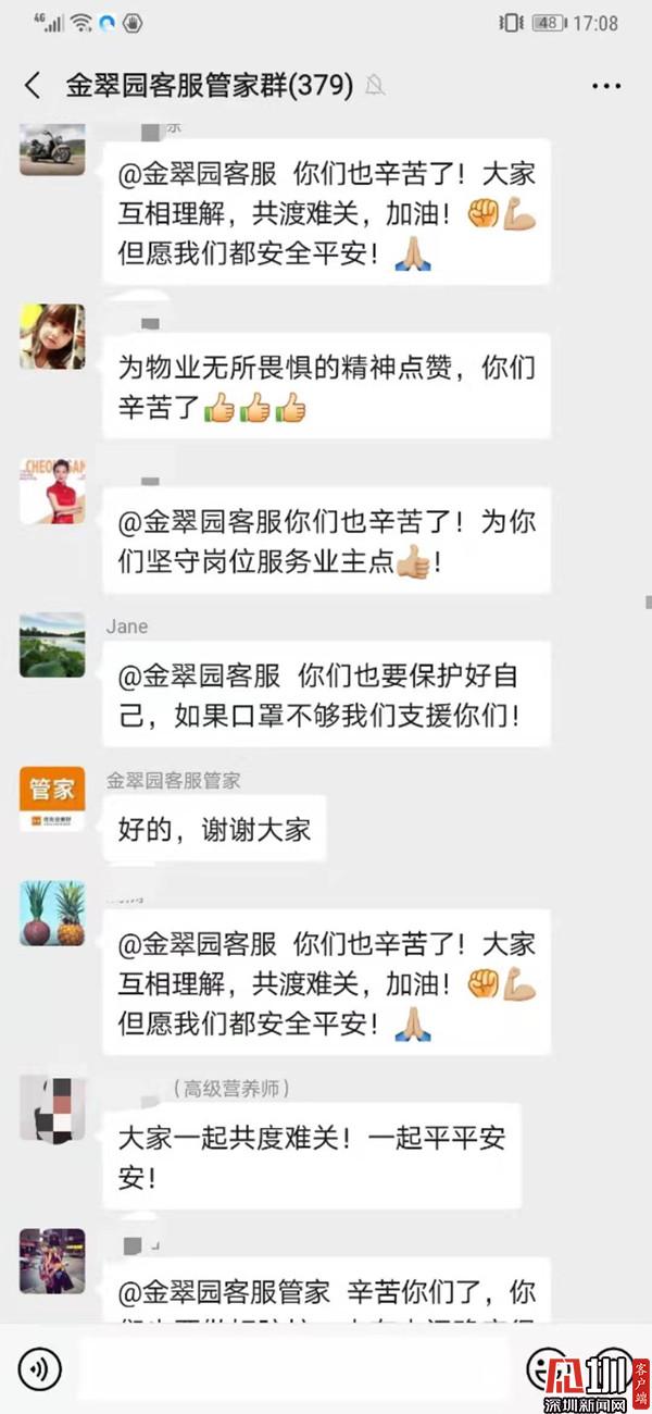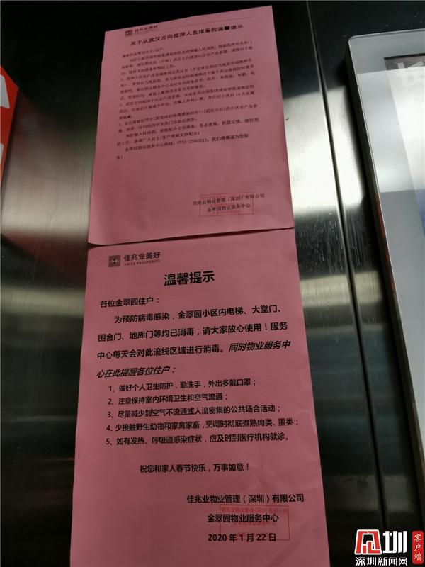 小區(qū)物業(yè)管理處主任鄒菊彬表示,目前小區(qū)每天進行3次全面消殺,包括地面、電梯、樓道等多個位置。他表示,小區(qū)內已張貼《新型冠狀病毒感染的肺炎相關知識和個人防護》等防護指引和宣傳資料。物業(yè)工作人員向還未返深的住戶進行了宣傳解釋,消除恐慌。對返深的小區(qū)住戶已做好詳細信息登記,對居家醫(yī)學觀察的住戶每天兩次隨訪,并經常給他們送一些生活用品?!拔覀兊墓ぷ魅藛T已經把電話留給他們,有啥需要幫忙的可以隨時聯(lián)系”,他說到。