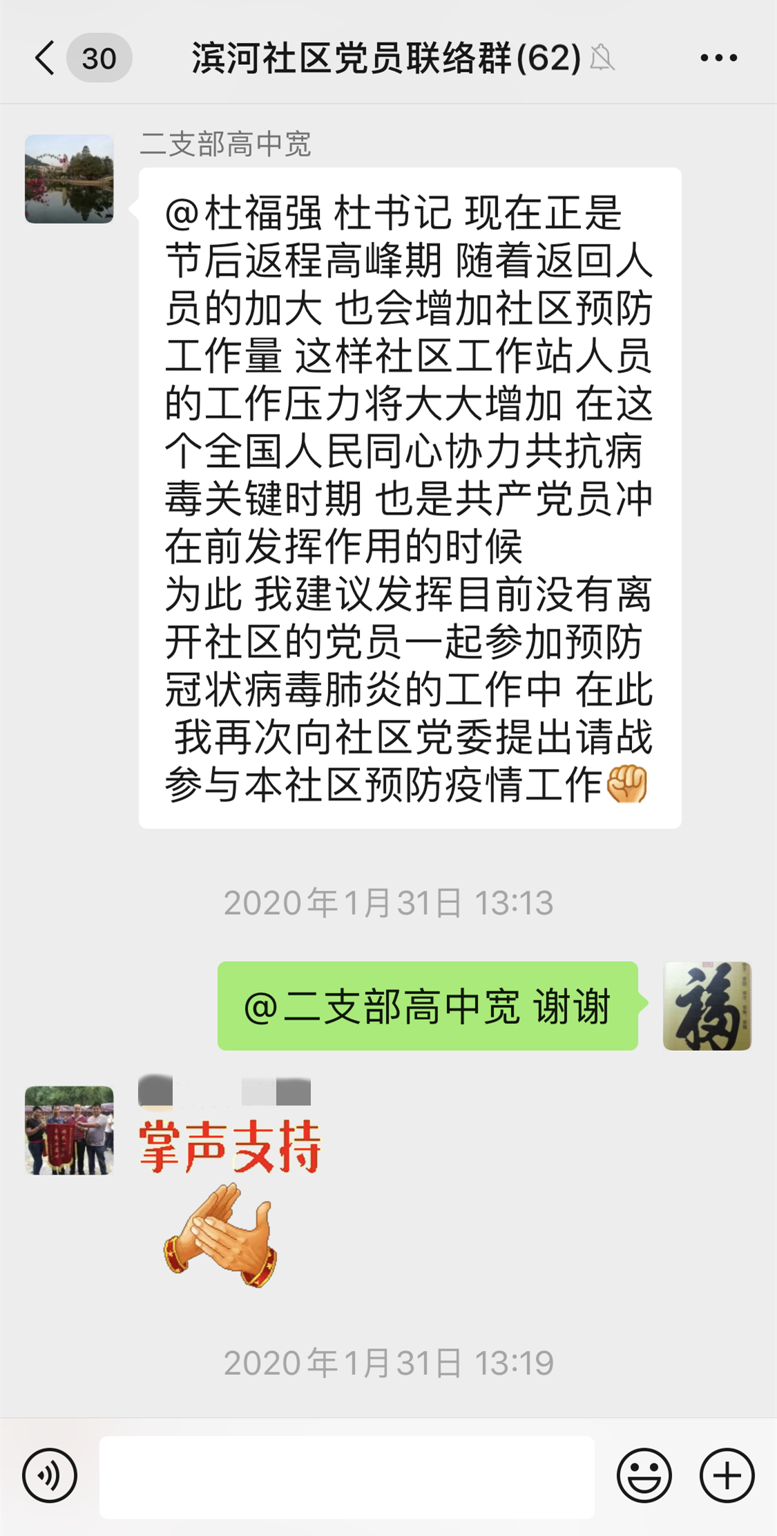 深圳新聞網(wǎng)2月2日訊(見圳客戶端、深圳新聞網(wǎng)記者 邱曉潔)“在此,我再次向社區(qū)黨委提出請(qǐng)戰(zhàn)參與本社區(qū)預(yù)防疫情工作?!?月31日,福田區(qū)南園街道濱河社區(qū)老黨員高中寬在濱河社區(qū)黨員聯(lián)絡(luò)微信群里再次主動(dòng)請(qǐng)纓參與社區(qū)疫情防控工作。