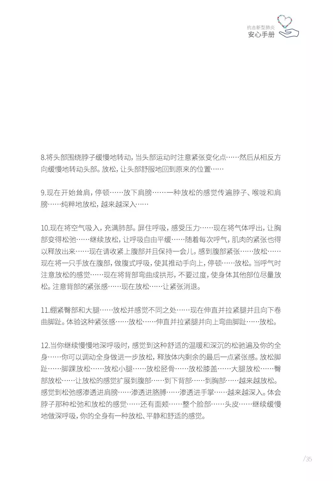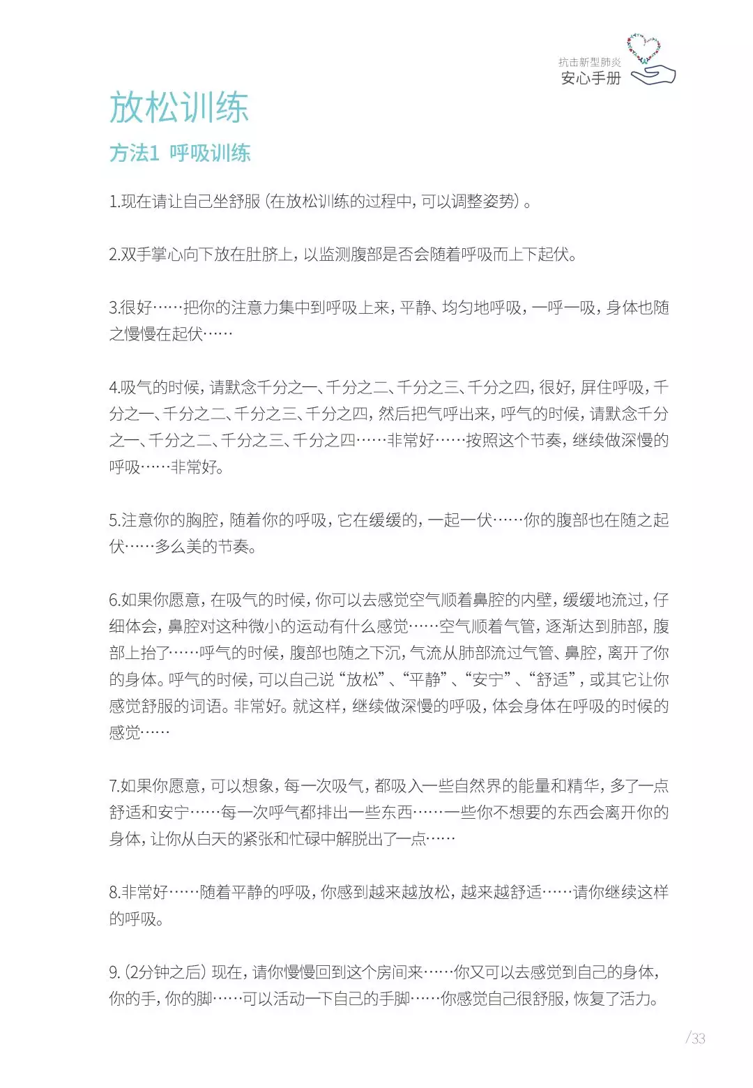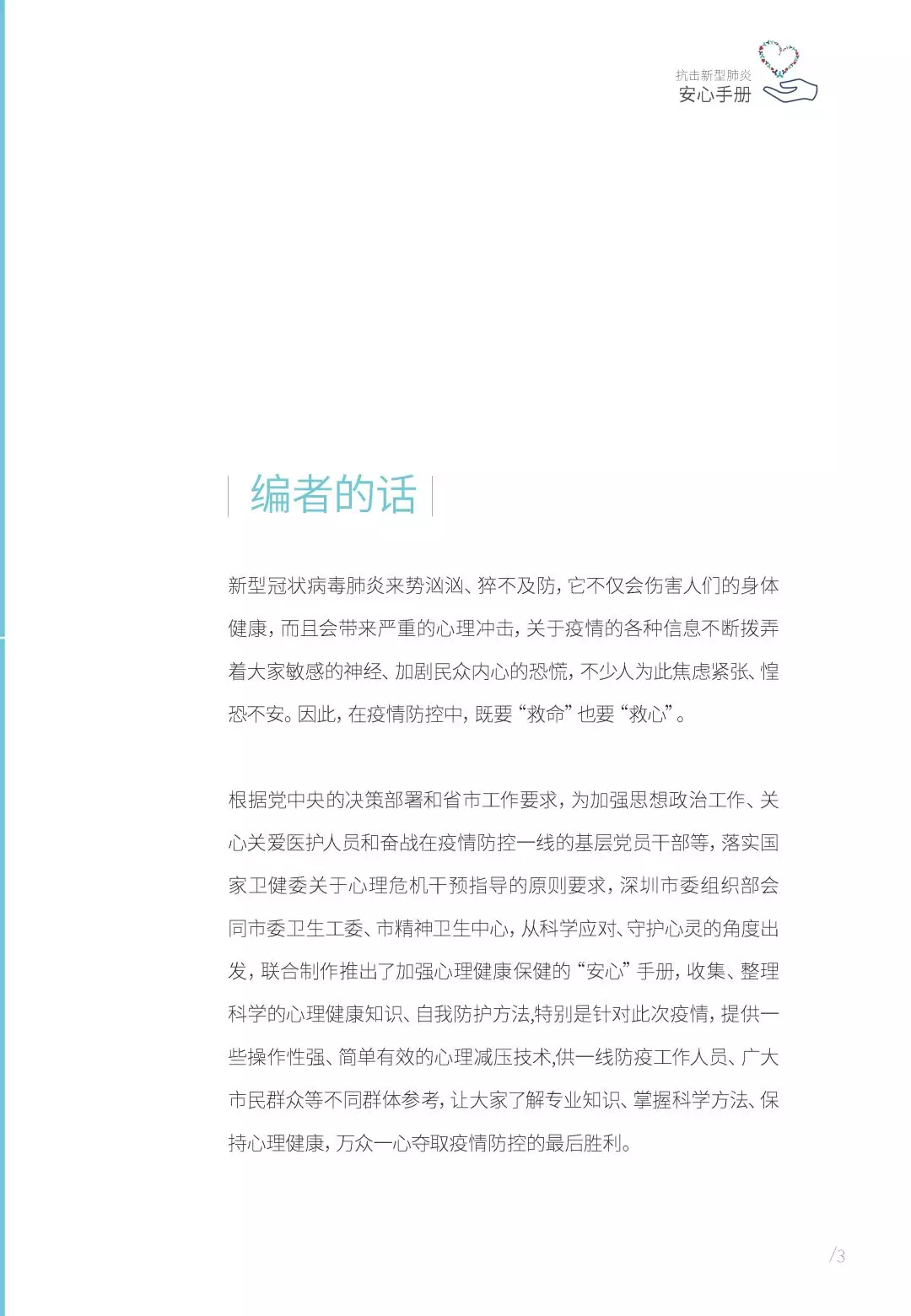 根據(jù)黨中央的決策部署和省市工作要求,為加強(qiáng)思想政治工作、關(guān)心關(guān)愛醫(yī)護(hù)人員和奮戰(zhàn)在疫情防控一線的基層黨員干部等,落實(shí)國家衛(wèi)健委關(guān)于心理危機(jī)干預(yù)指導(dǎo)的原則要求,深圳市委組織部會同市委衛(wèi)生工委、市精神衛(wèi)生中心,從科學(xué)應(yīng)對、守護(hù)心靈的角度出發(fā),聯(lián)合制作推出了加強(qiáng)心理健康保健的“安心”手冊,收集、整理科學(xué)的心理健康知識、自我防護(hù)方法,特別是針對此次疫情,提供一些操作性強(qiáng)、簡單有效的心理減壓技術(shù),供一線防疫工作人員、廣大市民群眾等不同群體參考,讓大家了解專業(yè)知識、掌握科學(xué)方法、保持心理健康,萬眾一心奪取疫情防控的最后勝利。