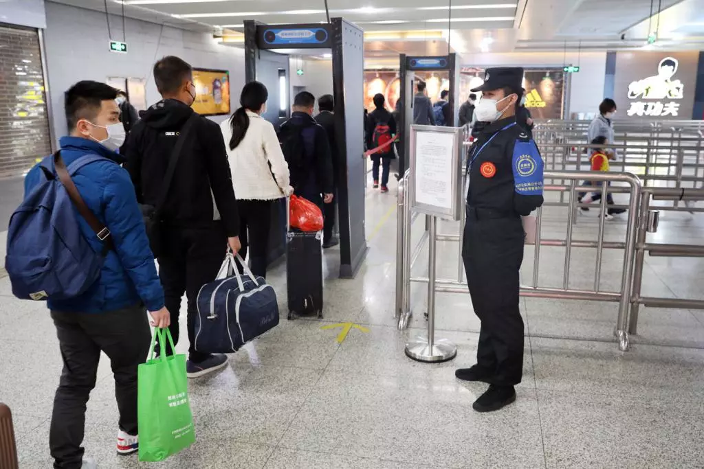 在地鐵站入口處,安檢人員檢查乘客是否佩戴口罩,并對未佩戴口罩人員進行勸返。